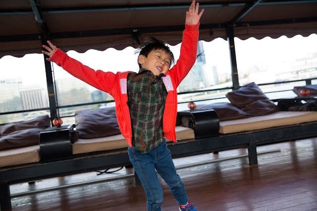 因為船上一直有播放住音樂, 所以哥哥跳起舞上嚟逗芊芊開心