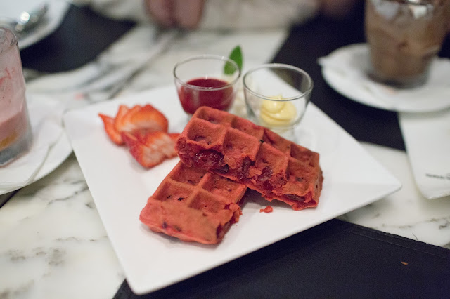 個賣相幾特別, 係全紅色嘅窩夫, 夾住紅莓! 加埋士多啤利酸酸甜甜幾好味
