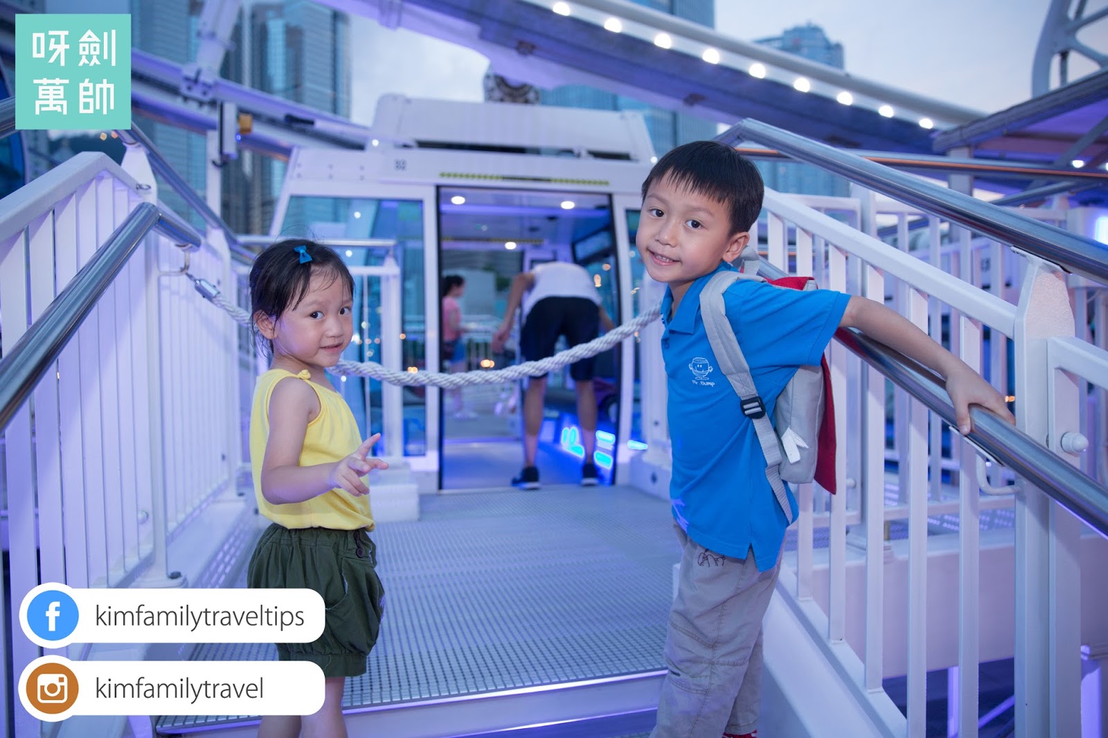 叫佢哋兩個坐喺門邊同維港影張相, 哥哥膽細到死, 影張相坐喺度半秒都話好驚!