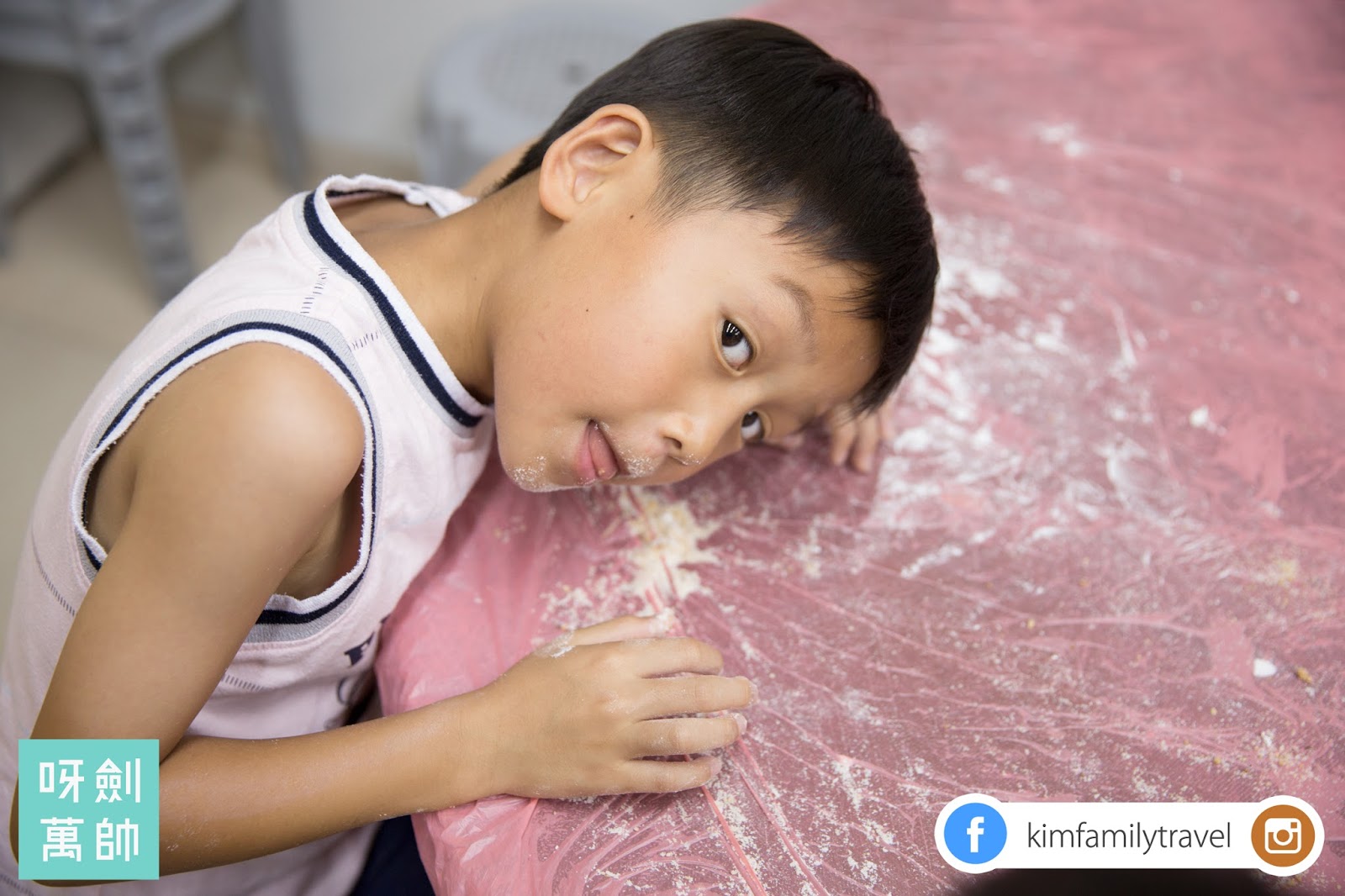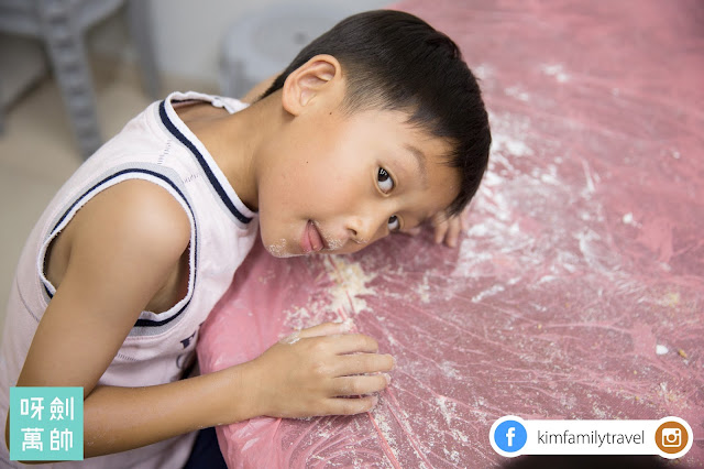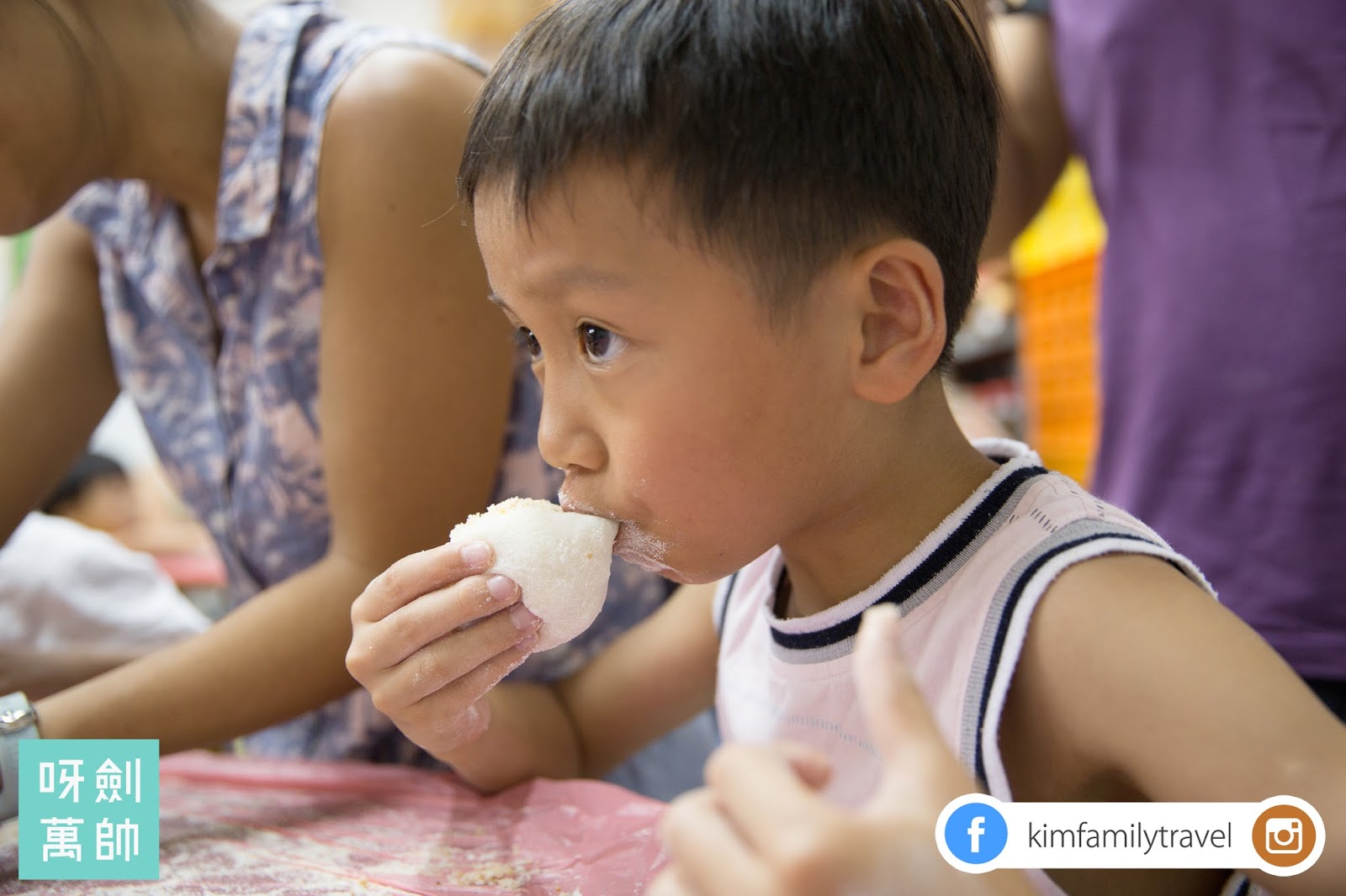 首先老闆娘教吓我哋點做...不過其實咩都預備好哂,小朋友要做嘅就只係將花生餡放入糯米團裡面,如果可以多少少工夫俾佢哋做就好,例如搓吓糯米粉,撈吓花生餡咁!