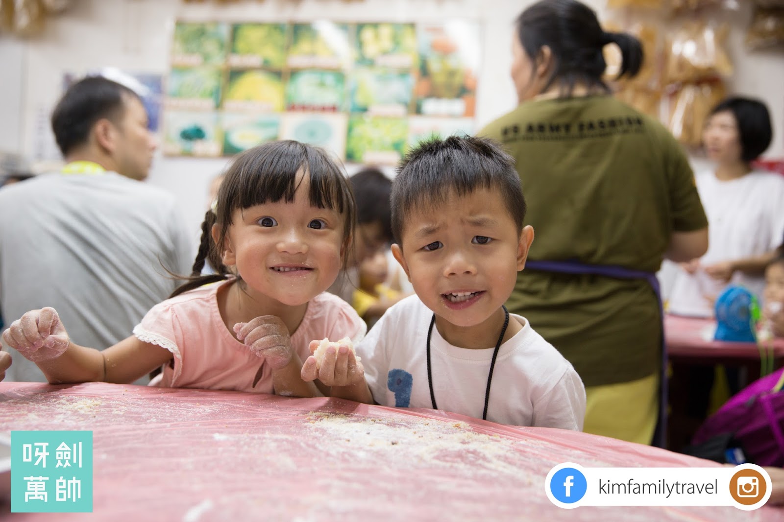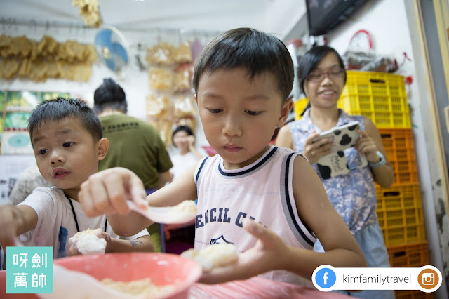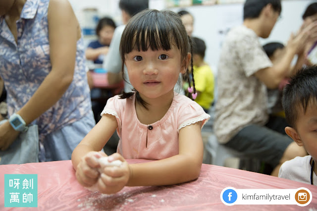 首先老闆娘教吓我哋點做...不過其實咩都預備好哂,小朋友要做嘅就只係將花生餡放入糯米團裡面,如果可以多少少工夫俾佢哋做就好,例如搓吓糯米粉,撈吓花生餡咁!