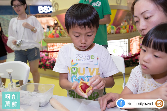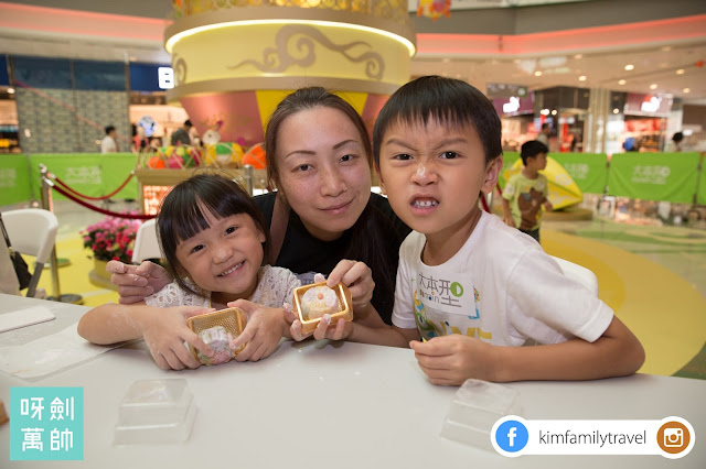 「邊個小朋友想開始先?」師傅一問兩個即刻爭舉手做先(因為師傅一個睇唔住咁多個,所以哥哥同妹妹都分開次序造月餅)
