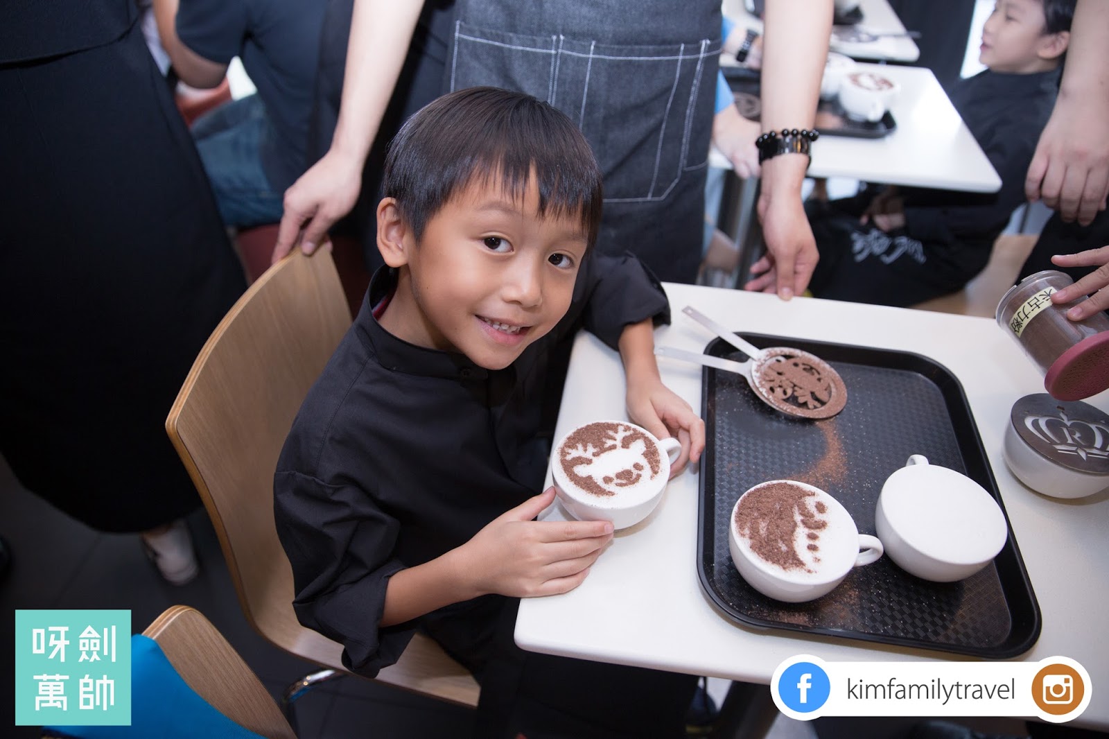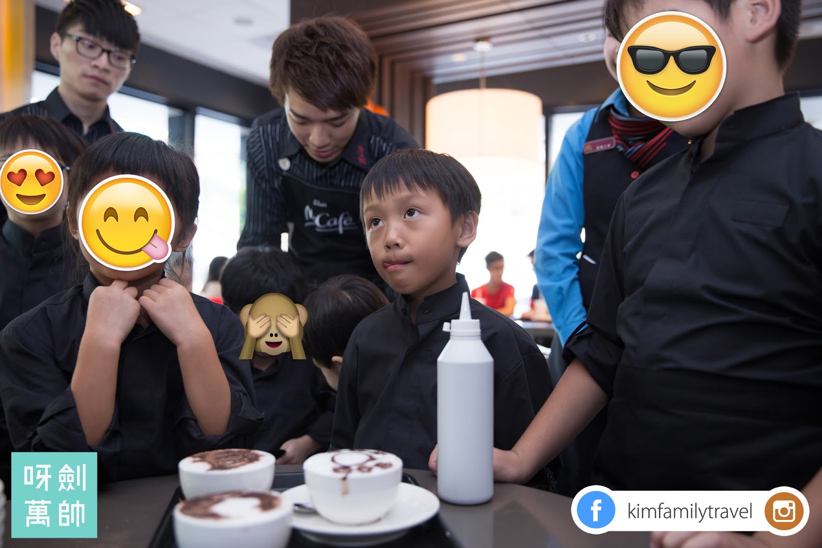 各位小小咖啡師在門口排好隊,姐姐教大家舉起右手齊聲講「歡迎光臨」!呢個動作對呢班咁怕醜嘅小朋友嚟講真係難....
