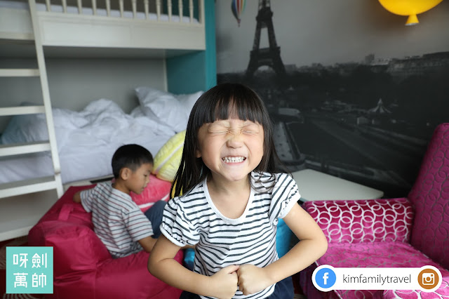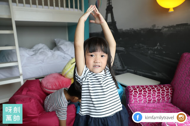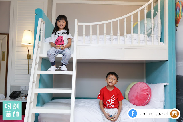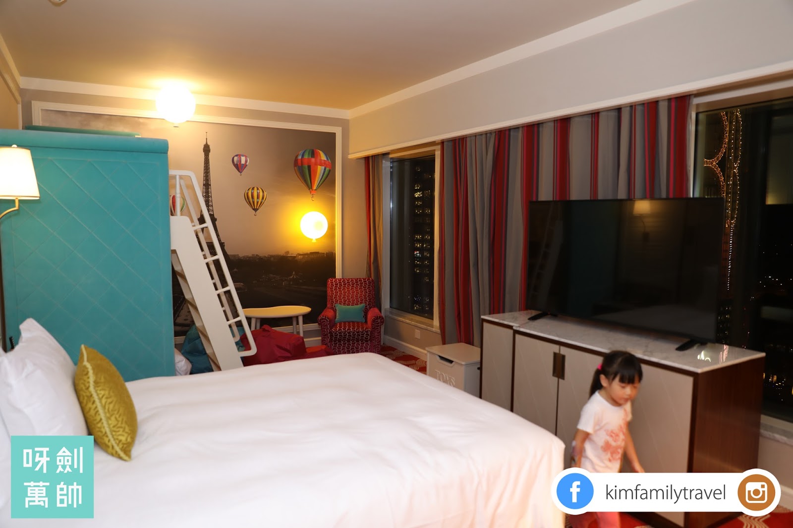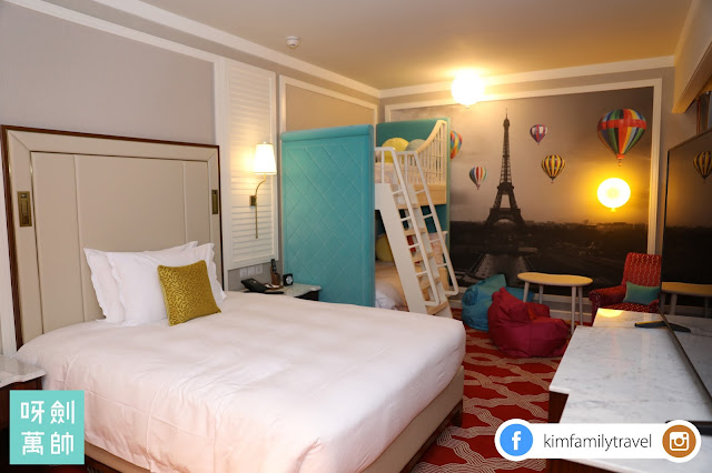 房間係屬於家庭式「天倫大床客房」一張大床+上下格床,室內環境仲好色彩繽紛,小朋友見到都好開心!