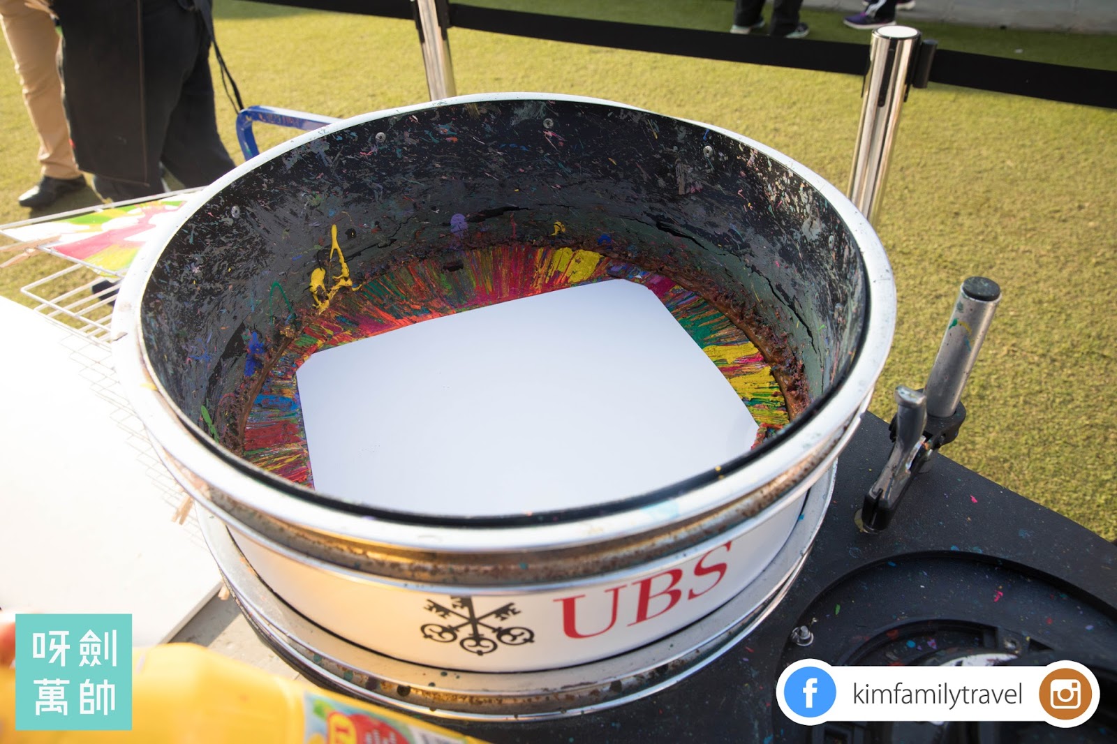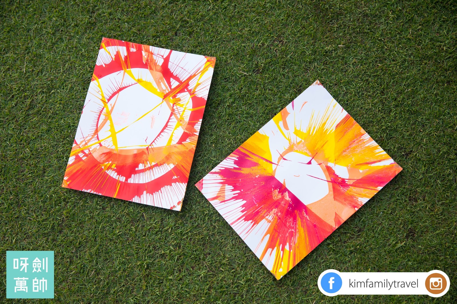 跟住哥哥就走咗去玩另外一樣嘢「單車繪畫」,個原理就係唧少少顏色落去單車前面個盤度,跟住坐上單車準備踩,每踩一下前面個轉盤就會高速旋轉,D顏色就會周圍咁飛,最後做成一張藝術畫