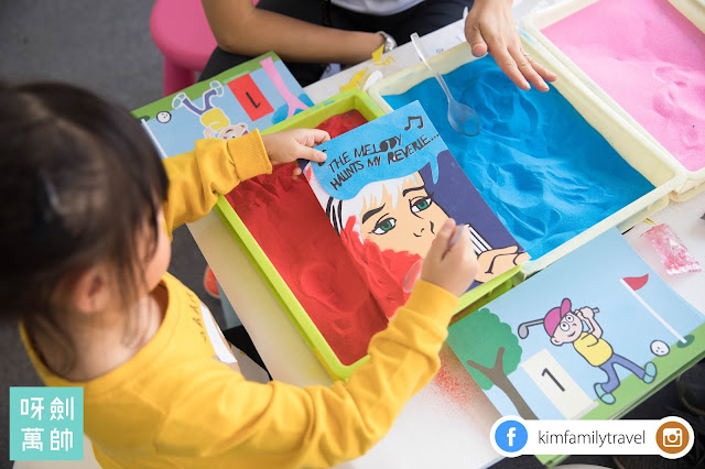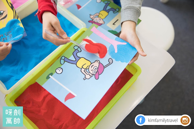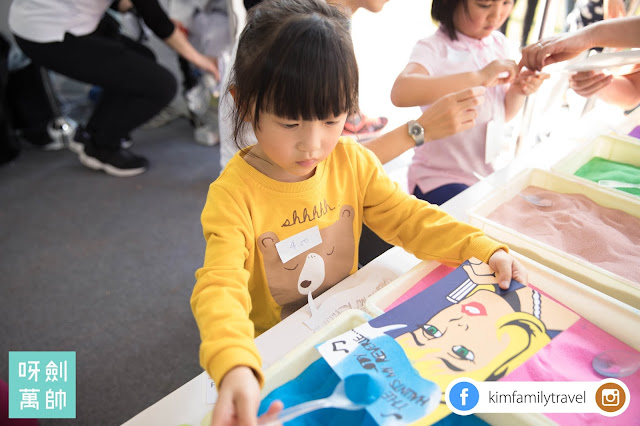 跟住我哋番到去Junior Art Hub一齊製作沙畫,同埋面部彩繪!沙畫的製作方法,原來只要將預先製作好的圖畫,撕開貼紙再選擇你想要的顏色嘅沙,用匙筆起倒落去上面,沙就會自動黏貼咗喺上面,原來出到嚟個效果都幾靚喎!