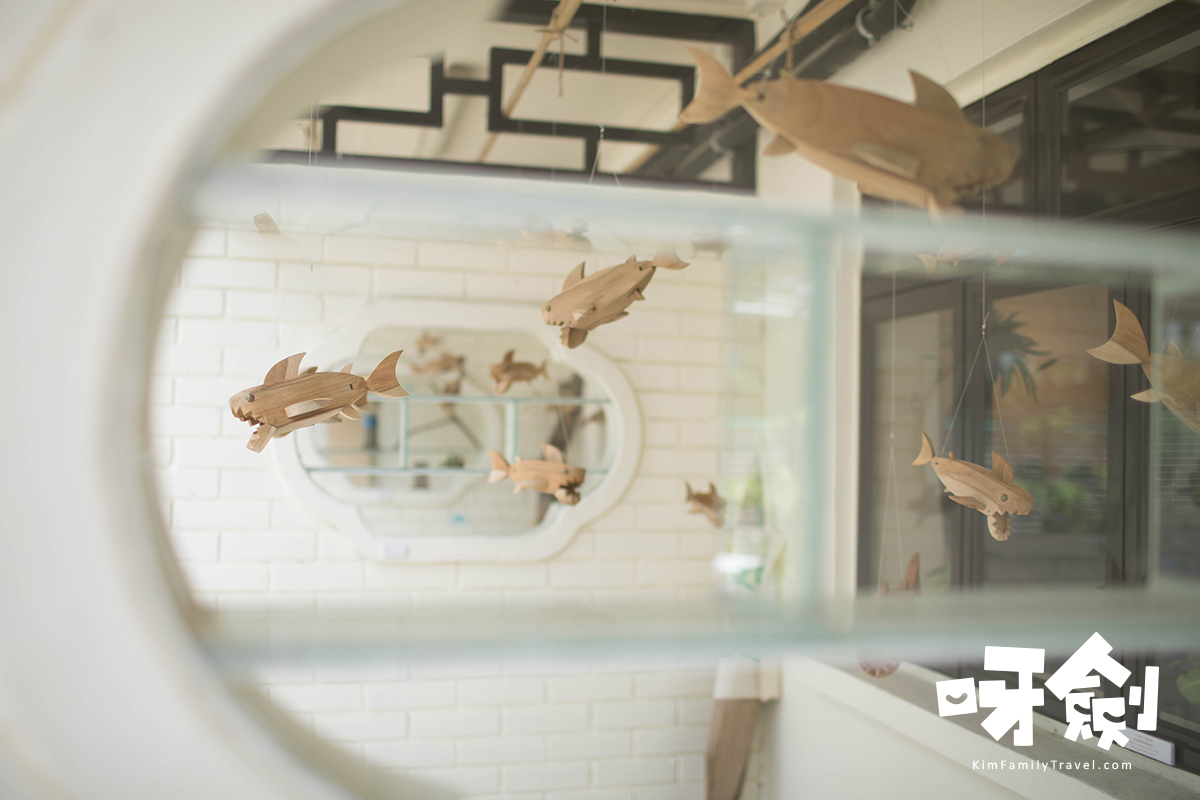 吊在天花的木製小鯊魚很特別(原來這裡也是一個小小藝術展覽的地方,稍後會再介紹)
