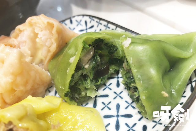 綠色 (菠菜汁) 餡 (素菜、小棠菜、冬菇粒) ~ 必定想到是最素的一款水餃。