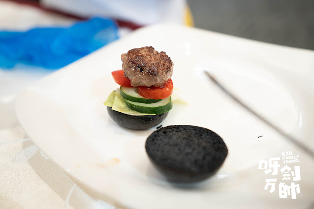 新鮮牛肉一落鍋煎真係超香,呀芊就慢慢一層一層的配料砌上去。