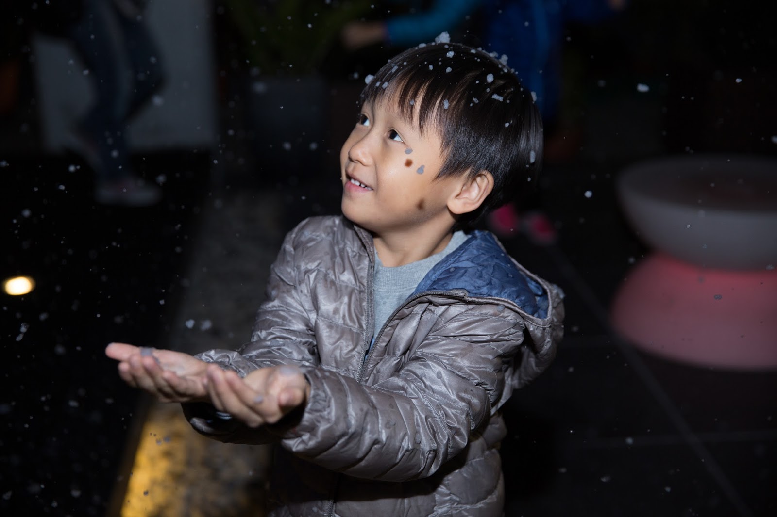 我哋走到去射燈前再影,終於若隱若現咁睇到少少飄雪啦