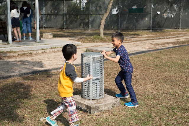 哥哥之後就走去爬樹!同朋友仔執樹枝,呢度仲有幾棵樹斬咗可以玩梅花樁