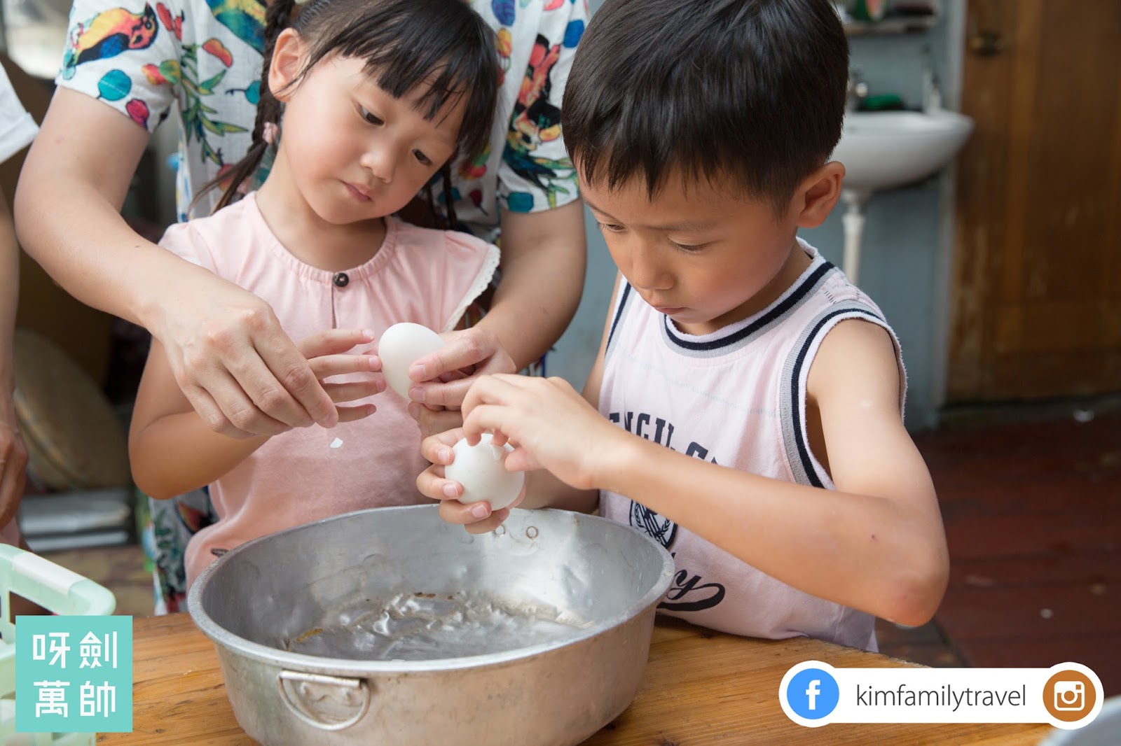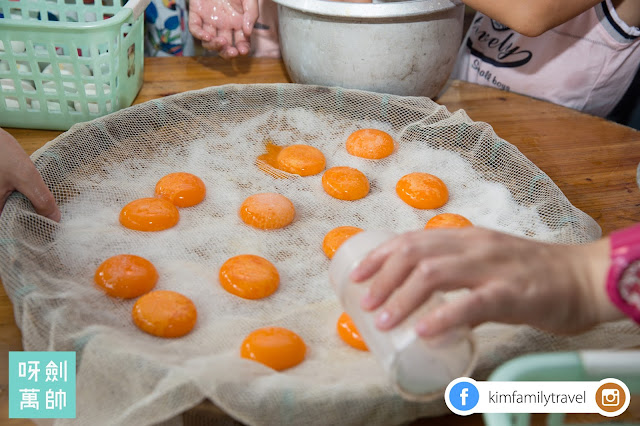 兩大枱嘅鴨蛋同竹筏放哂喺度!首先姨姨教我哋點樣敲打鴨蛋同埋拎出蛋黃