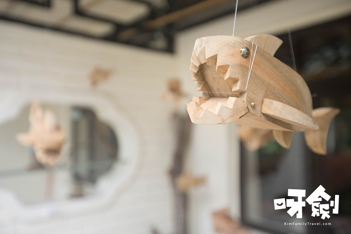 吊在天花的木製小鯊魚很特別(原來這裡也是一個小小藝術展覽的地方,稍後會再介紹)