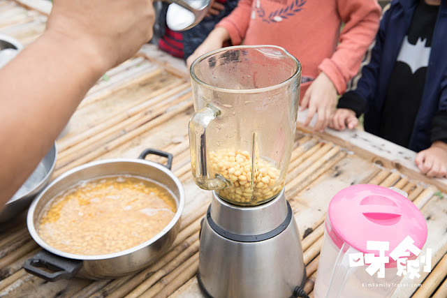 同樣由原材料開始教小朋友點樣整豆腐花,先將黃豆放入去攪拌機攪碎!