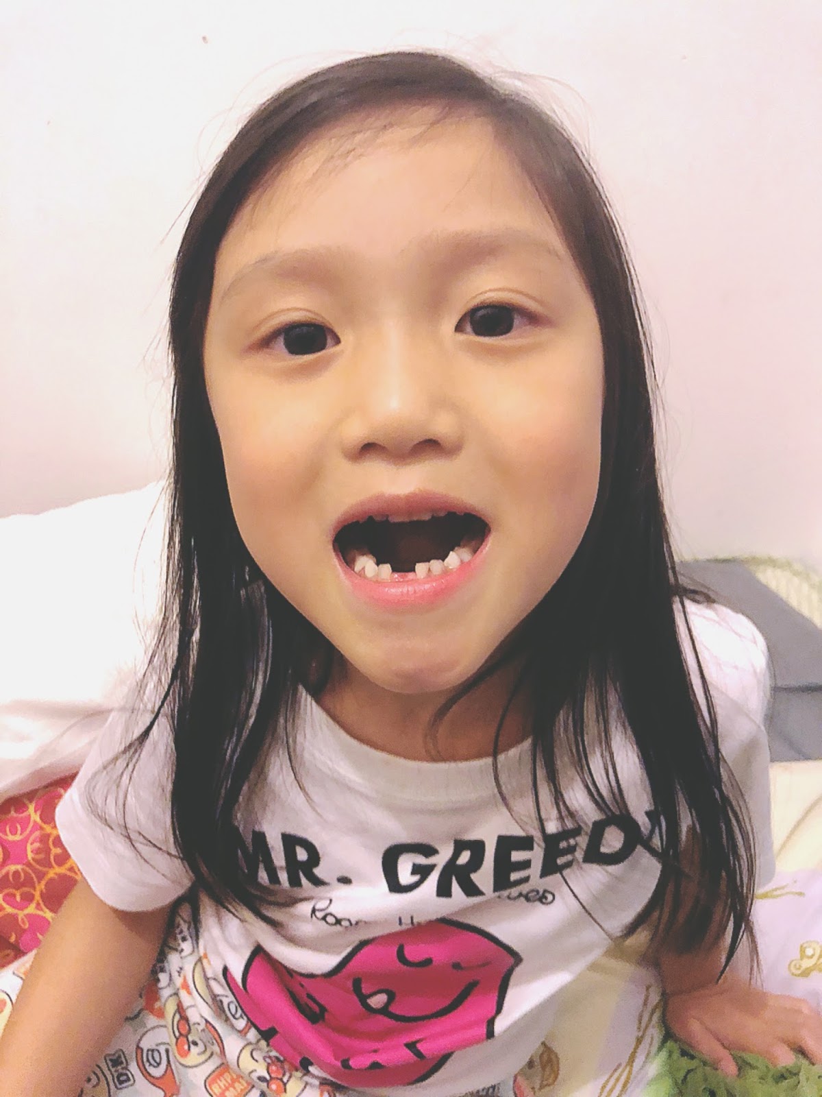 這天工人突然Whatsapp傳來的一張照片,原來是芊芊的脫牙的樣子,這個5歲人仔,在我上班的時侯,突然在家中吃蛋時脫了第一隻牙齒。
